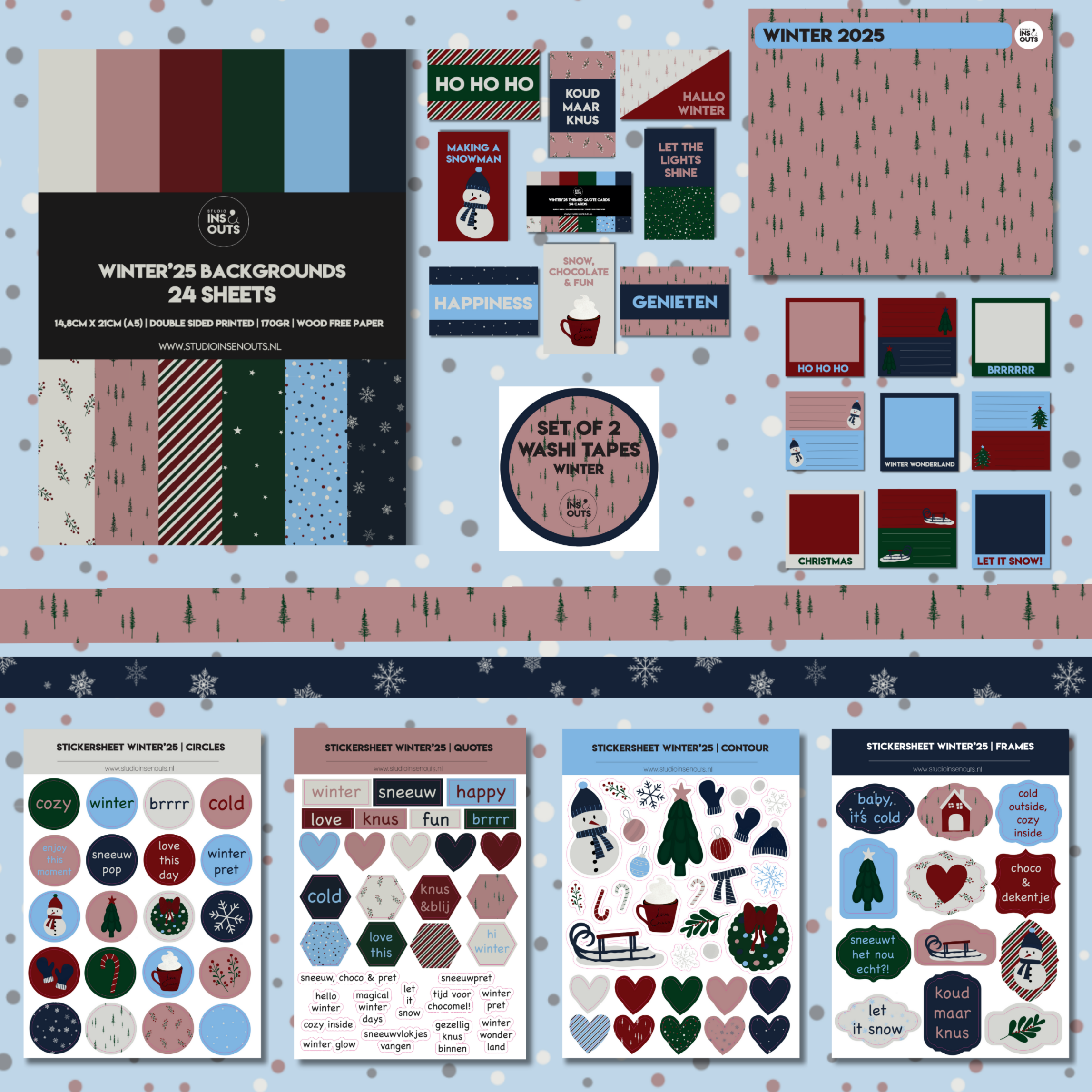 De Winter’25 paperpad is perfect voor invulboeken, scrapbooks en fotoboeken met een winter- of kerstthema. Combineer de vellen met stickers, washi tapes en quote kaartjes uit andere Studio Ins & Outs collecties om een warme, feestelijke look te creëren.
