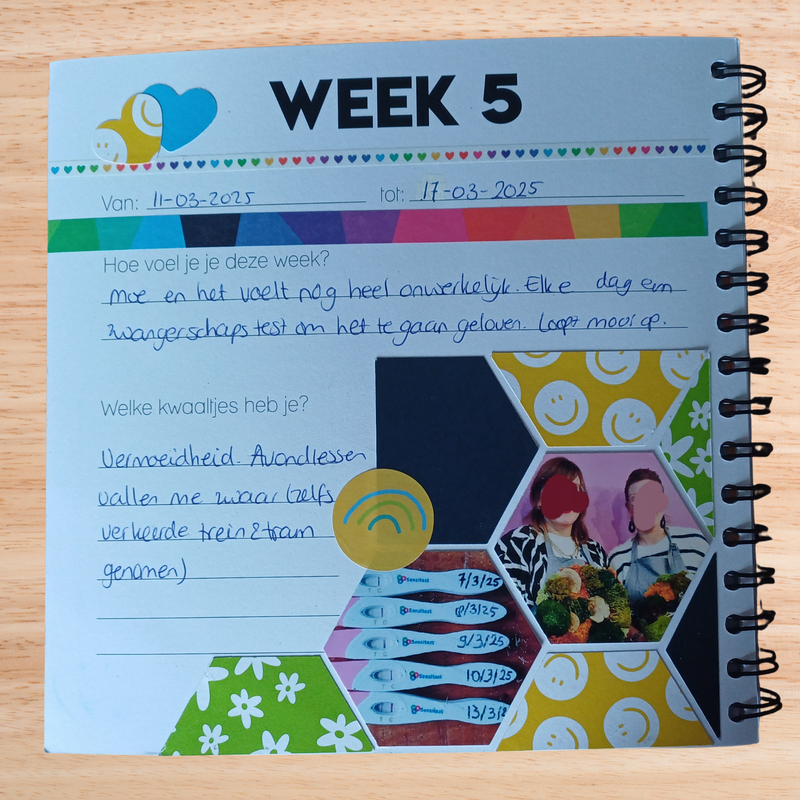 - Indeling: Invulpagina’s per week, ruimte voor echo’s, foto’s, checklisten en verhalen