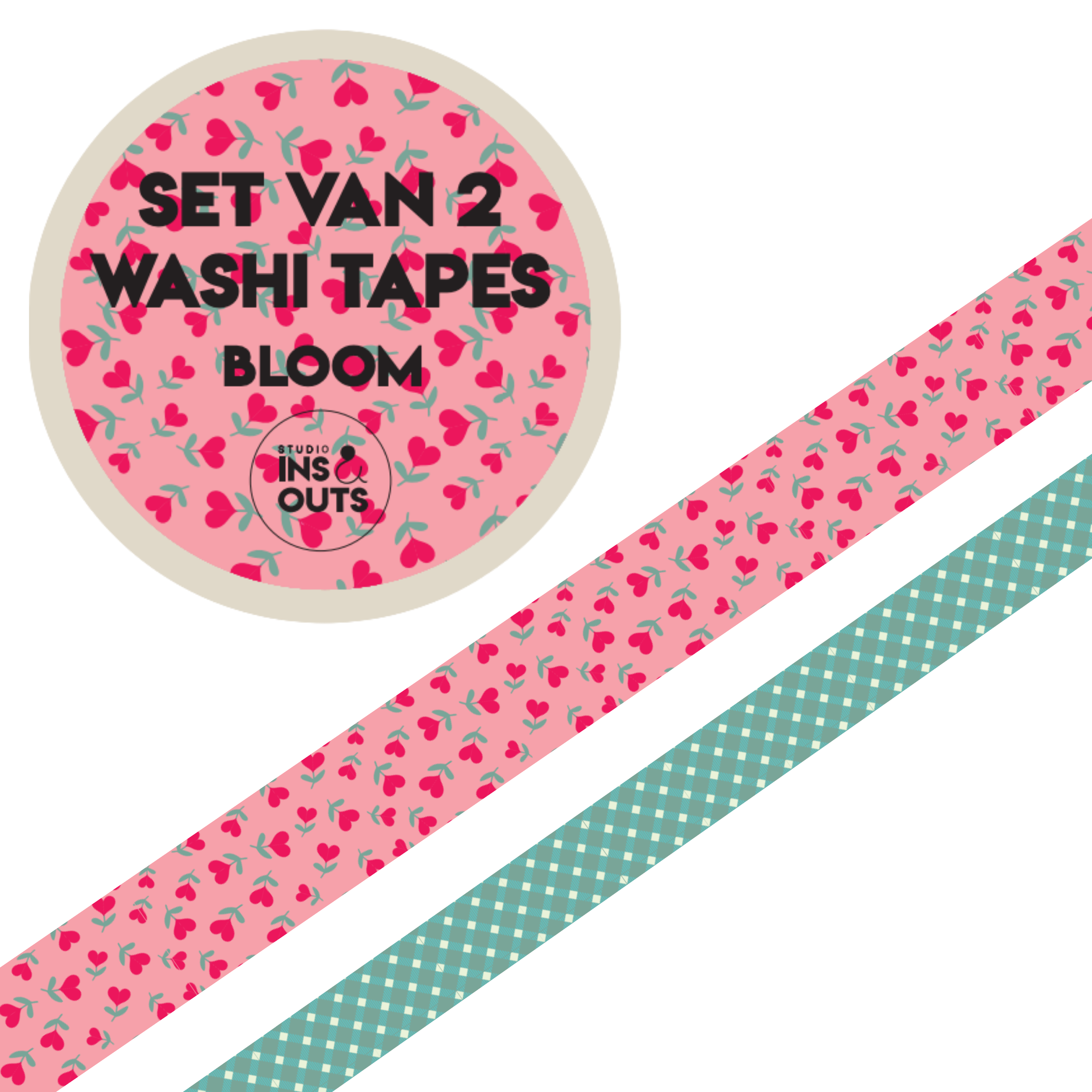 Washi tapes set van 2: Twee bijpassende tapes met hartjesbloemetjes (1 cm) en een ruitpatroon (0,5 cm). Ideaal voor randen, accenten en het vastzetten van foto’s op je pagina.