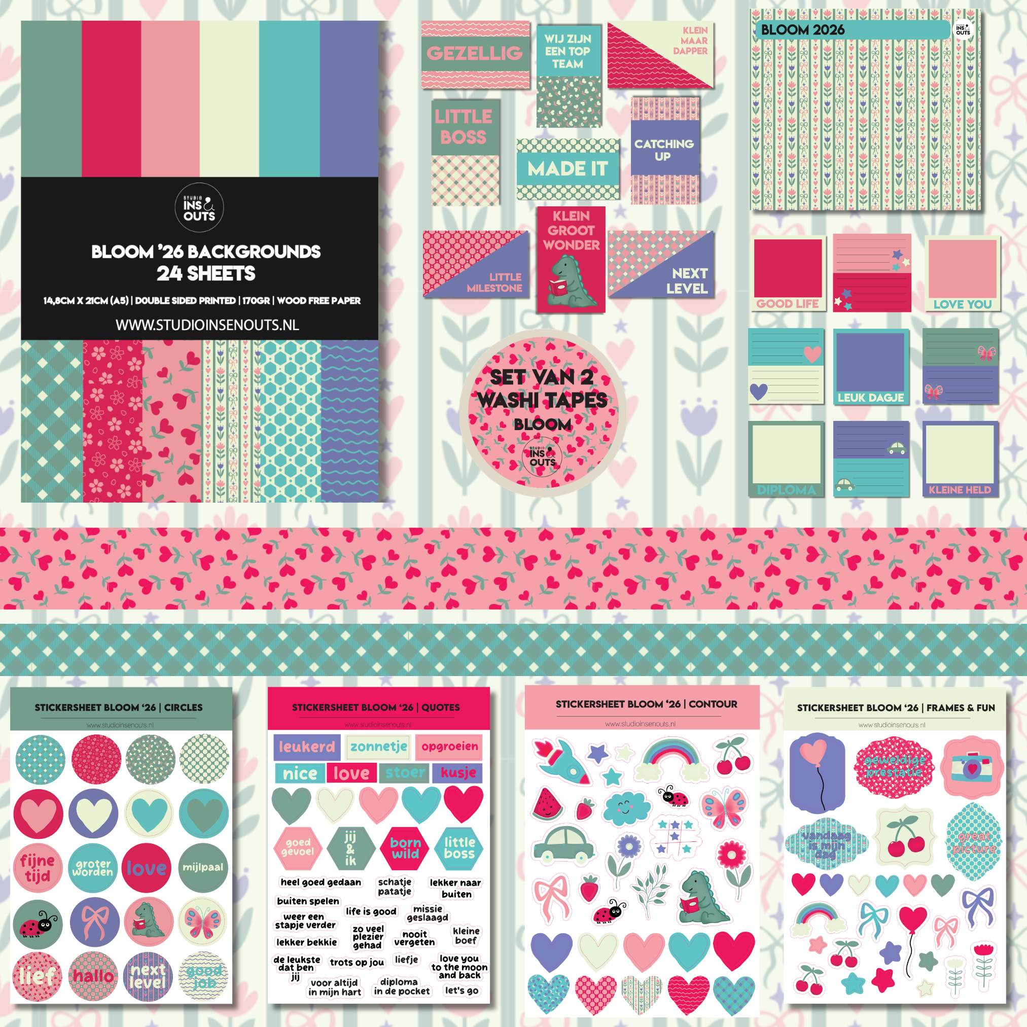 De Bloom ’26 collectie van Studio Ins & Outs is een complete scrapbook set met een frisse, vrolijke uitstraling. Deze collectie is ontworpen voor pagina’s over opgroeien, mijlpalen, familie en dagelijkse herinneringen. De set bevat een paperpad, stickers, washi tapes en kaartjes die perfect op elkaar zijn afgestemd. De herkenbare Bloom kleuren groen, fuchsia roze, lichtroze, crème, blauw en paars zorgen voor een speelse en creatieve basis voor scrapbooking, journaling, invulboeken en fotoboeken.