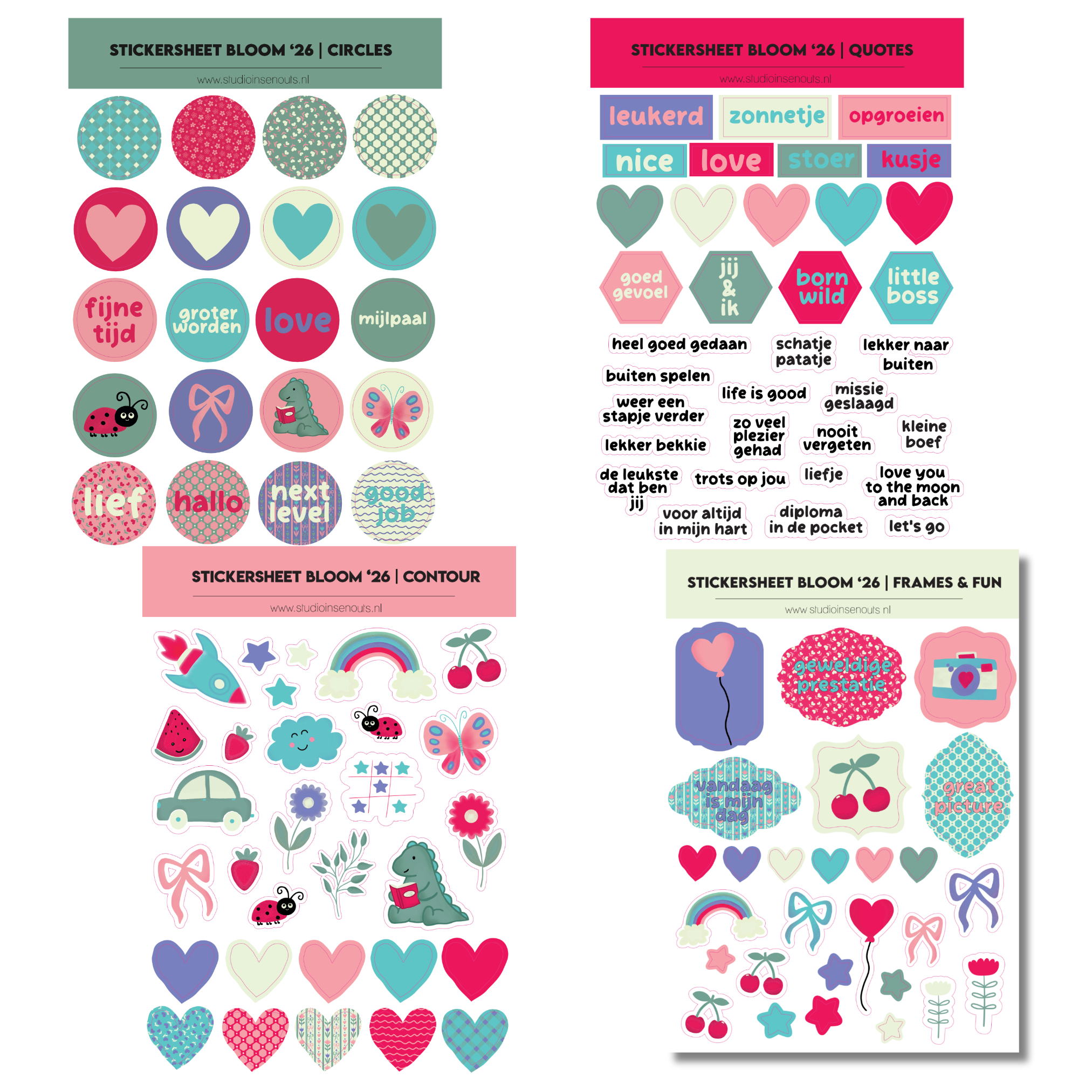Stickervellen: 4 vellen (circles, quotes, contour en frames & fun) met ronde stickers, tekststickers, illustraties, labels en kleine decoratieve elementen die perfect aansluiten bij de Bloom stijl.