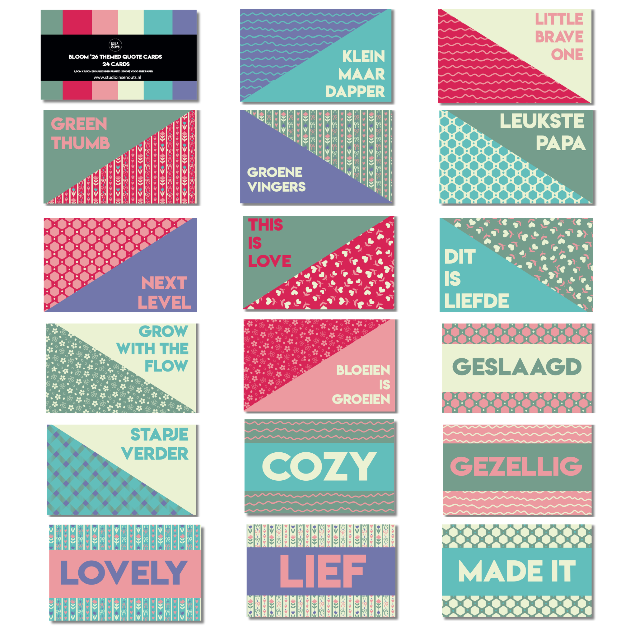 - Aantal: 24 quote kaartjes (dubbelzijdig)