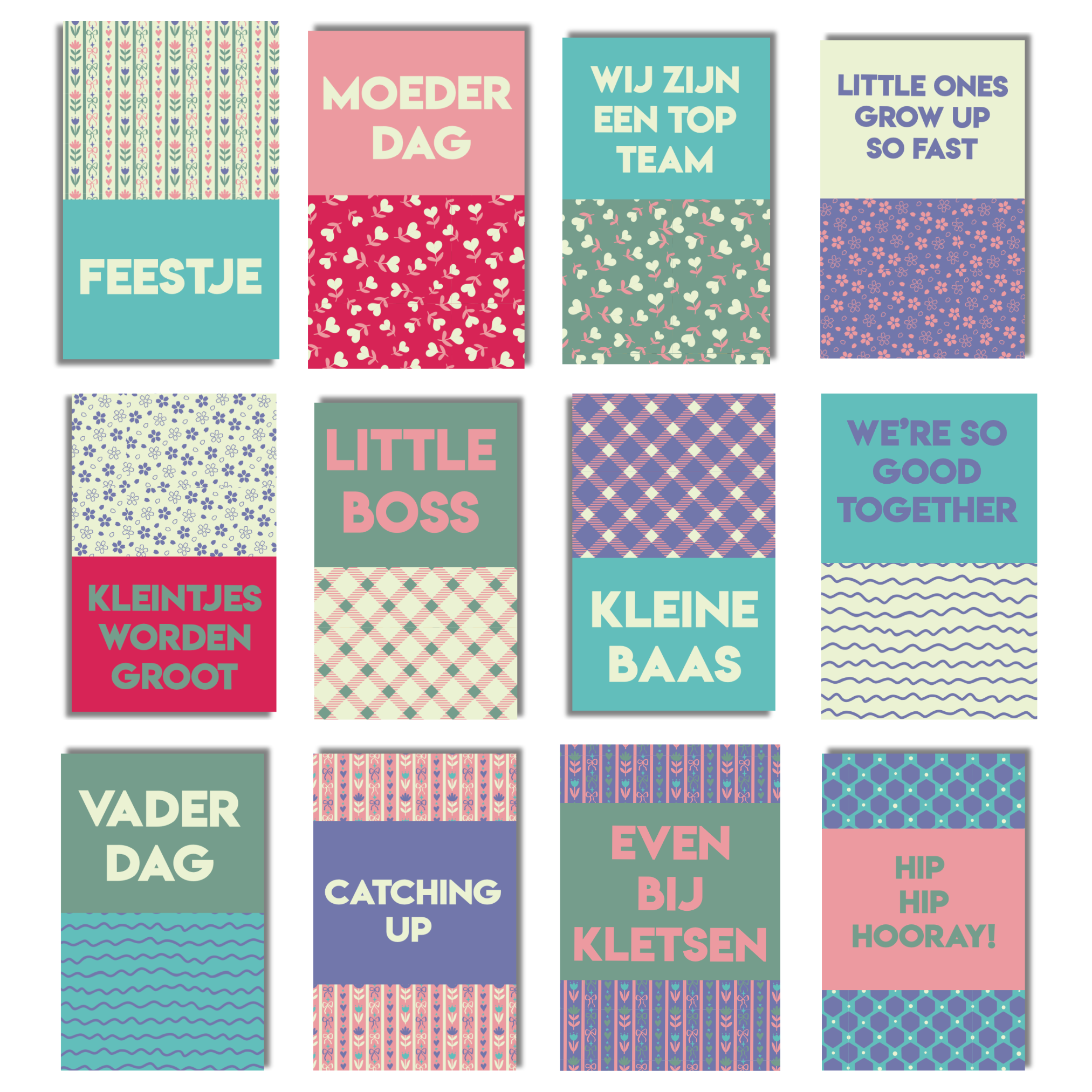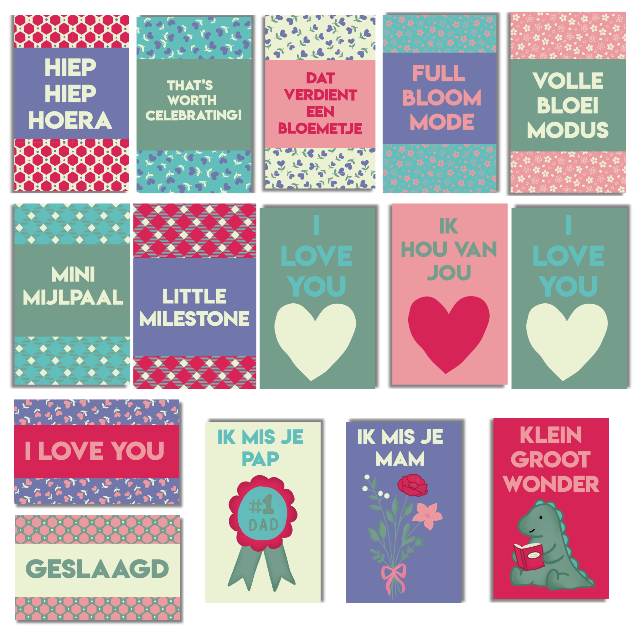 In deze set vind je ook speciale quote kaartjes voor Vaderdag en Moederdag. Teksten zoals “Leukste papa”, “Liefste mama”, “Papa”, “Mama”, “Vaderdag” en “Moederdag” maken het eenvoudig om pagina’s te maken over momenten met je ouders of familie. Tegelijkertijd is er ook ruimte voor een persoonlijkere kant van herinneringen. Daarom bevat de set ook kaartjes zoals “Ik mis je pap” en “Ik mis je mam”, voor mensen die hun ouders moeten missen maar hun herinneringen graag een plek geven in hun scrapbook of fotoboek.