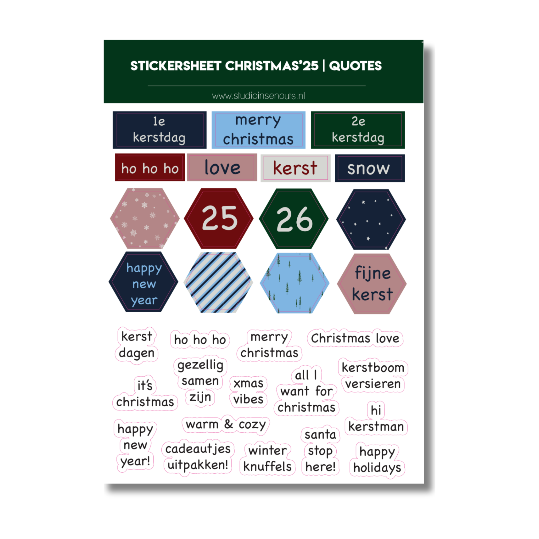 Versier je creatieve projecten in feestelijke kerstsfeer met het Stickervel Quotes Christmas’25 van Studio Ins & Outs. Dit vrolijke stickervel bevat 30 kerststickers in sfeervolle tinten zoals donkergroen, nachtblauw, bordeaux en zachtroze. Ideaal voor gebruik in je scrapbook, journal, planner, invulboek of fotoboek. De stickers zijn perfect om de decembermaand vast te leggen en je pagina’s een warme, winterse uitstraling te geven.