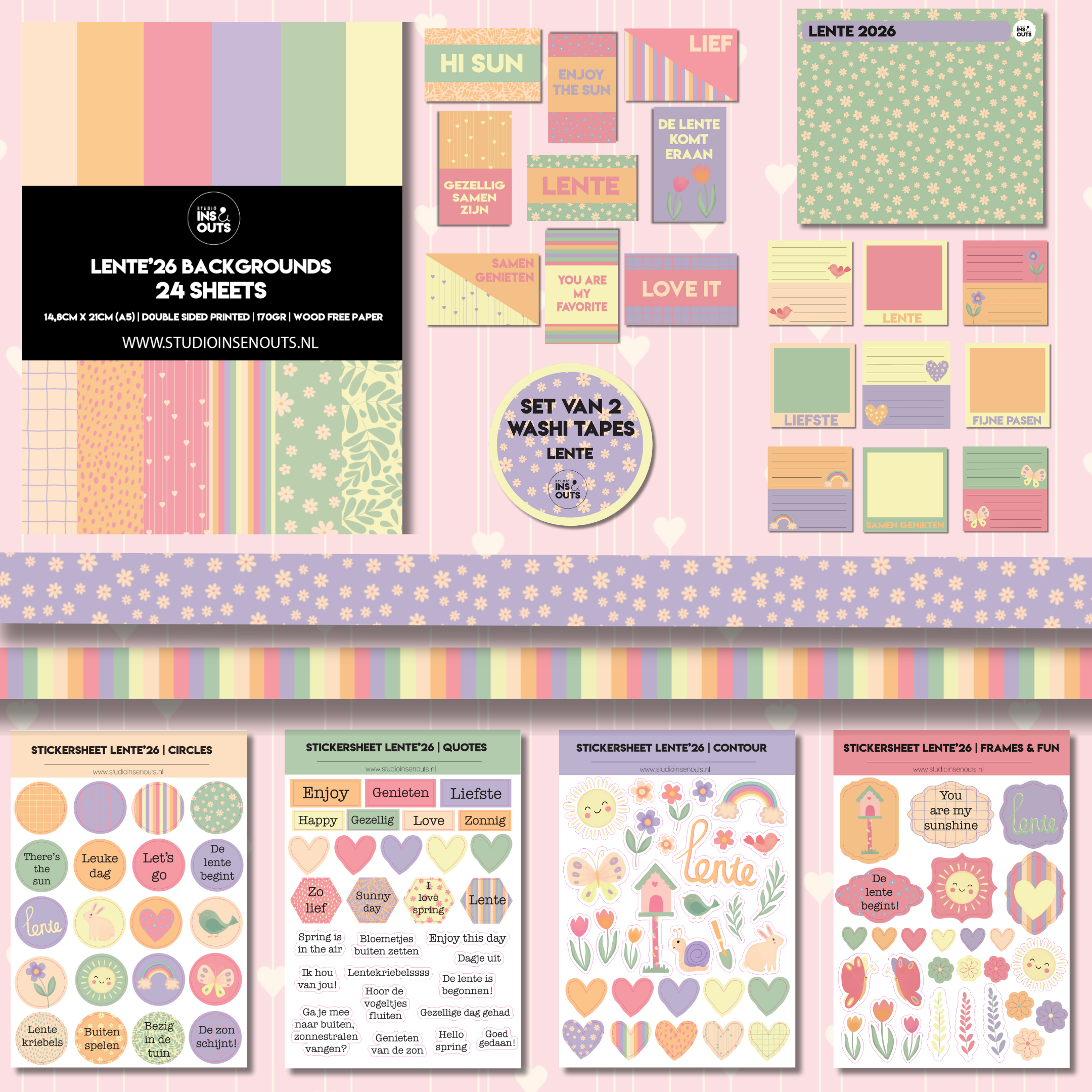 De Lente’26 collectie van Studio Ins & Outs is een complete scrapbook set voor het vastleggen van alledaagse momenten, lente-uitjes en paasdagen. Deze set is samengesteld voor gebruik in invulboeken, scrapbooks, journals en fotoboeken. Alle onderdelen zijn op elkaar afgestemd in kleur en stijl, zodat je eenvoudig overzichtelijke en samenhangende pagina’s maakt.