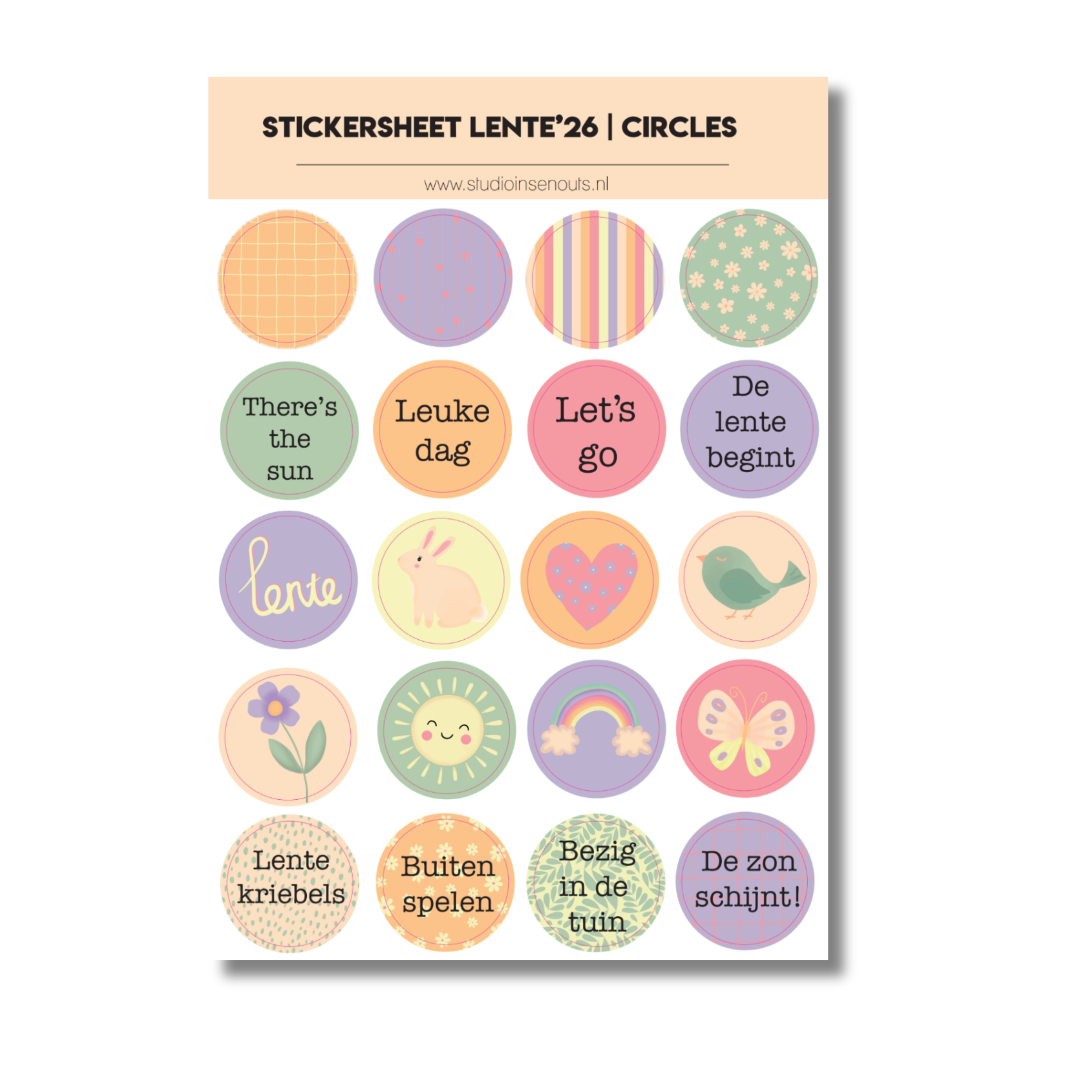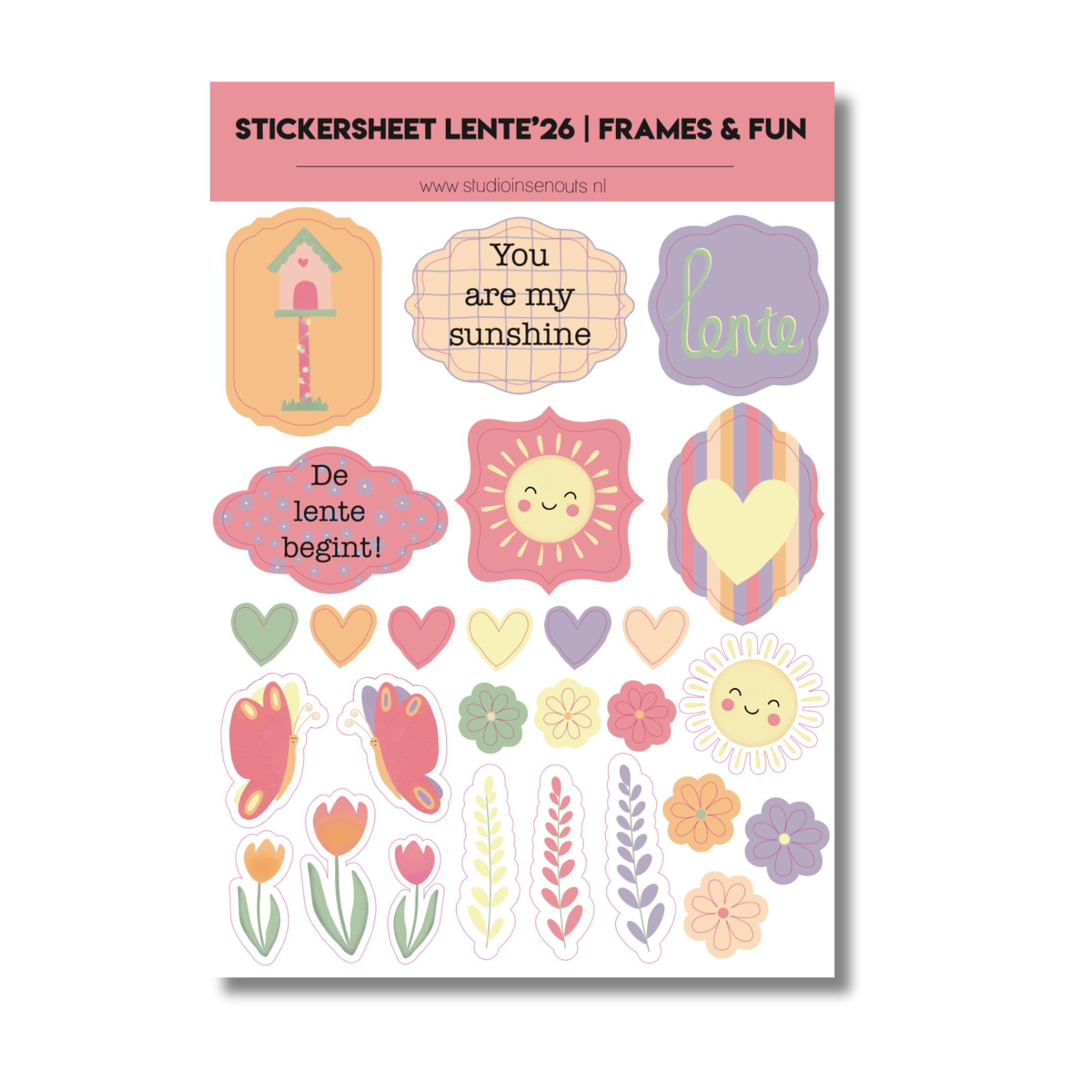 • Stickervellen: 4 stickervellen (circles, quotes, contour en frames & fun) met bloemen, zonnetjes, hartjes, dieren, frames en korte teksten in Lente’26 stijl.