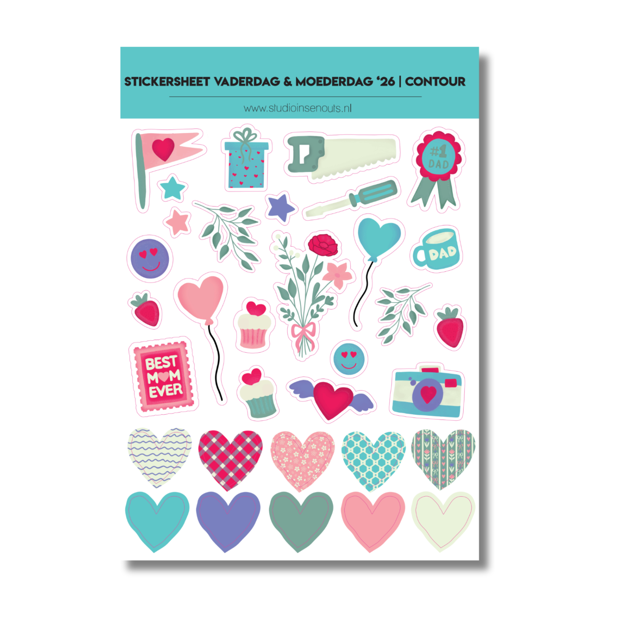 Stickervel Vaderdag & Moederdag met illustratie stickers zoals hartjes, bloemen en cadeautjes. Perfect voor scrapbook, fotoboek, journal en familiedagen.