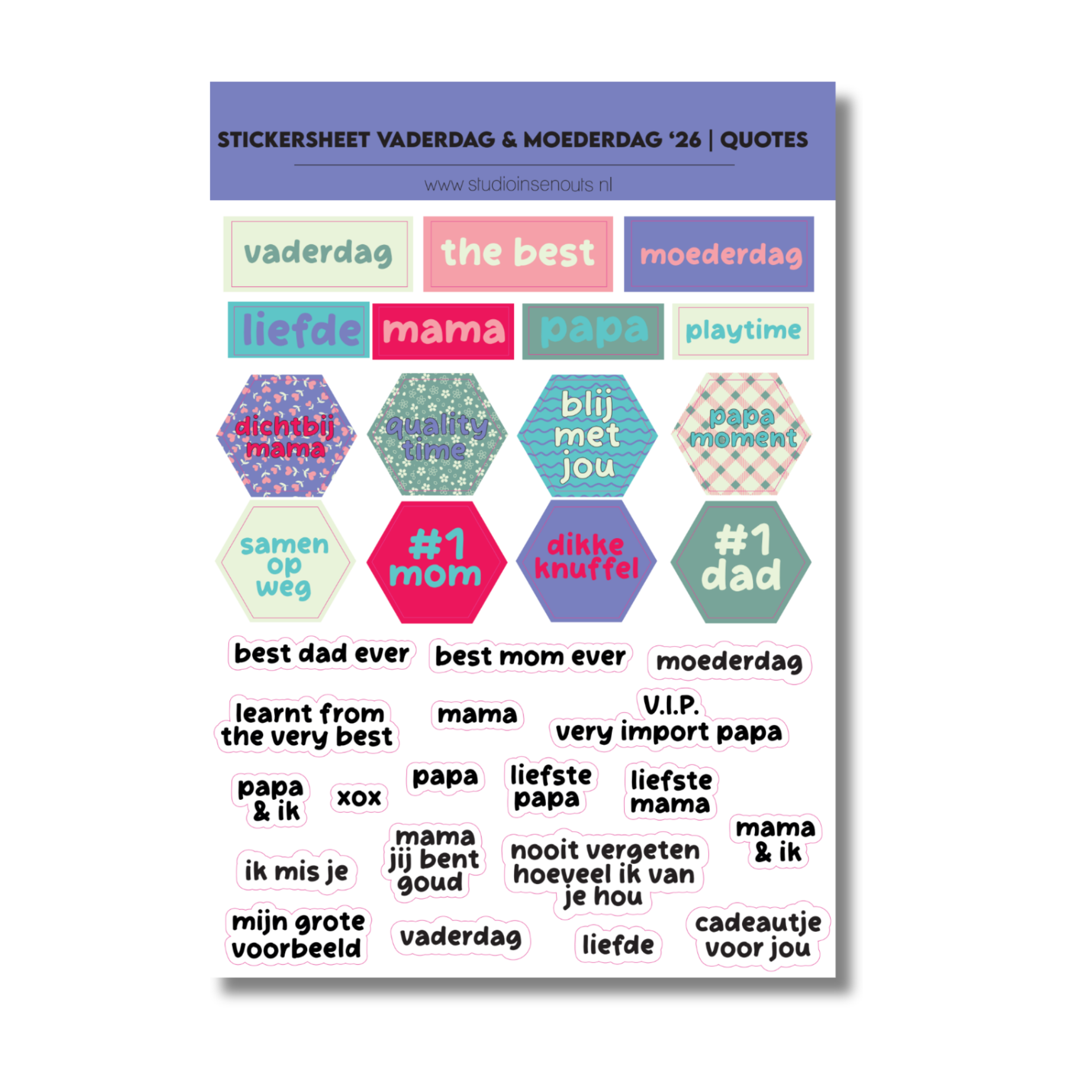 Stickervel Vaderdag & Moederdag met quotes en tekststickers voor papa en mama. Perfect voor scrapbook, fotoboek, journal en familiedagen.