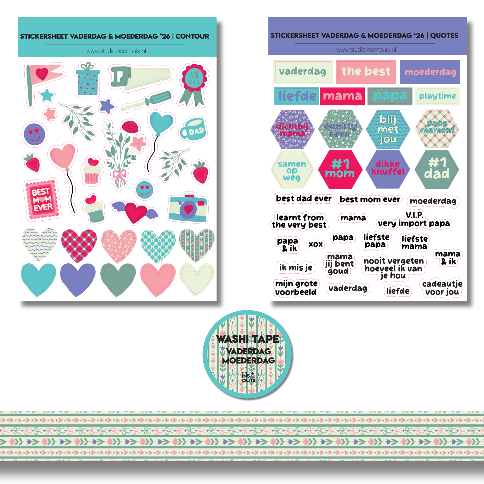 Deze mini collectie van Studio Ins & Outs is ontworpen voor het vastleggen van momenten met papa en mama. De mini scrapbook set bestaat uit twee bijpassende stickervellen en een brede washi tape van 1,5 cm met een decoratief patroon van bloemen, hartjes en grafische details. De set is geschikt voor het decoreren van invulboeken, scrapbooks, plakboeken en journals rondom Vaderdag, Moederdag en familiedagen.