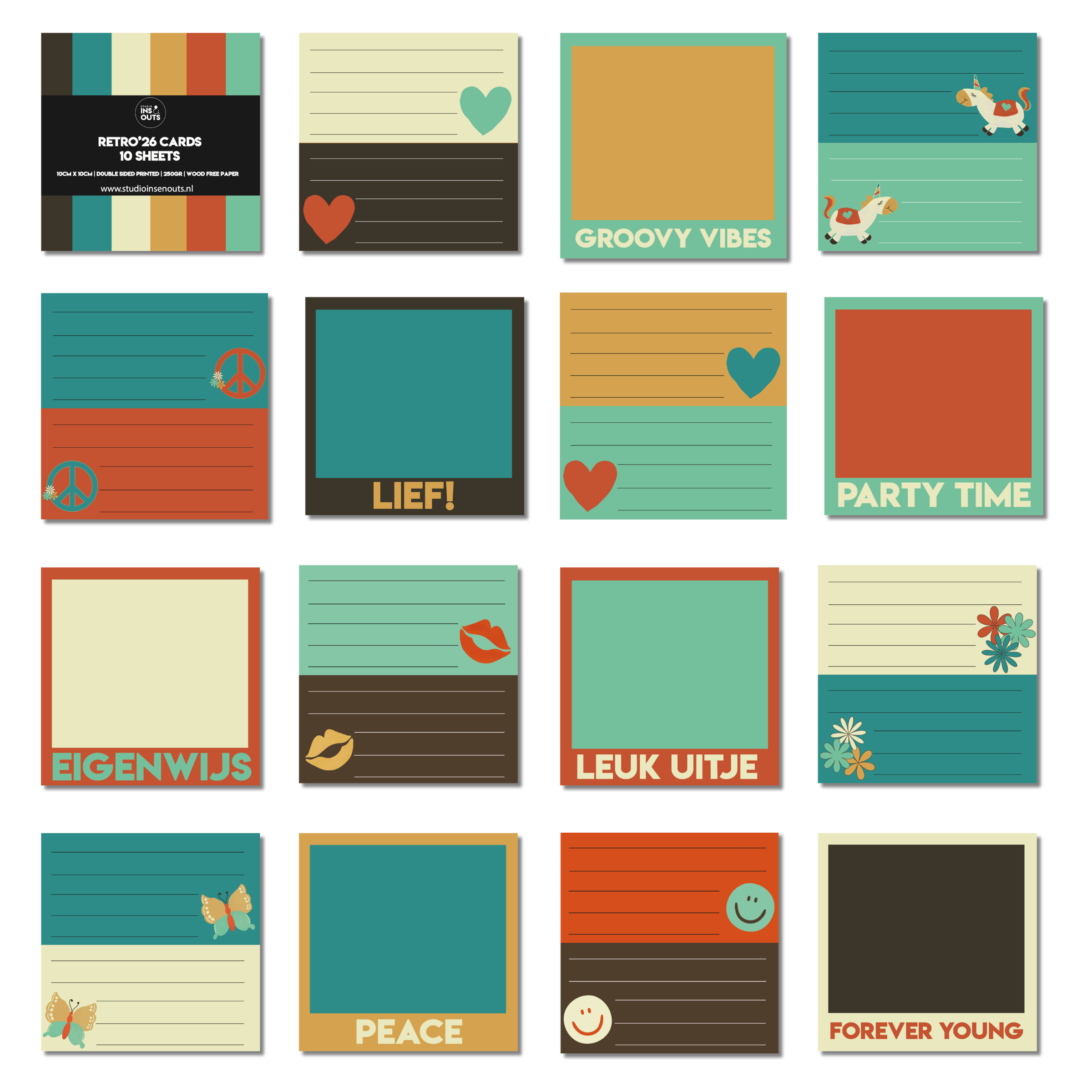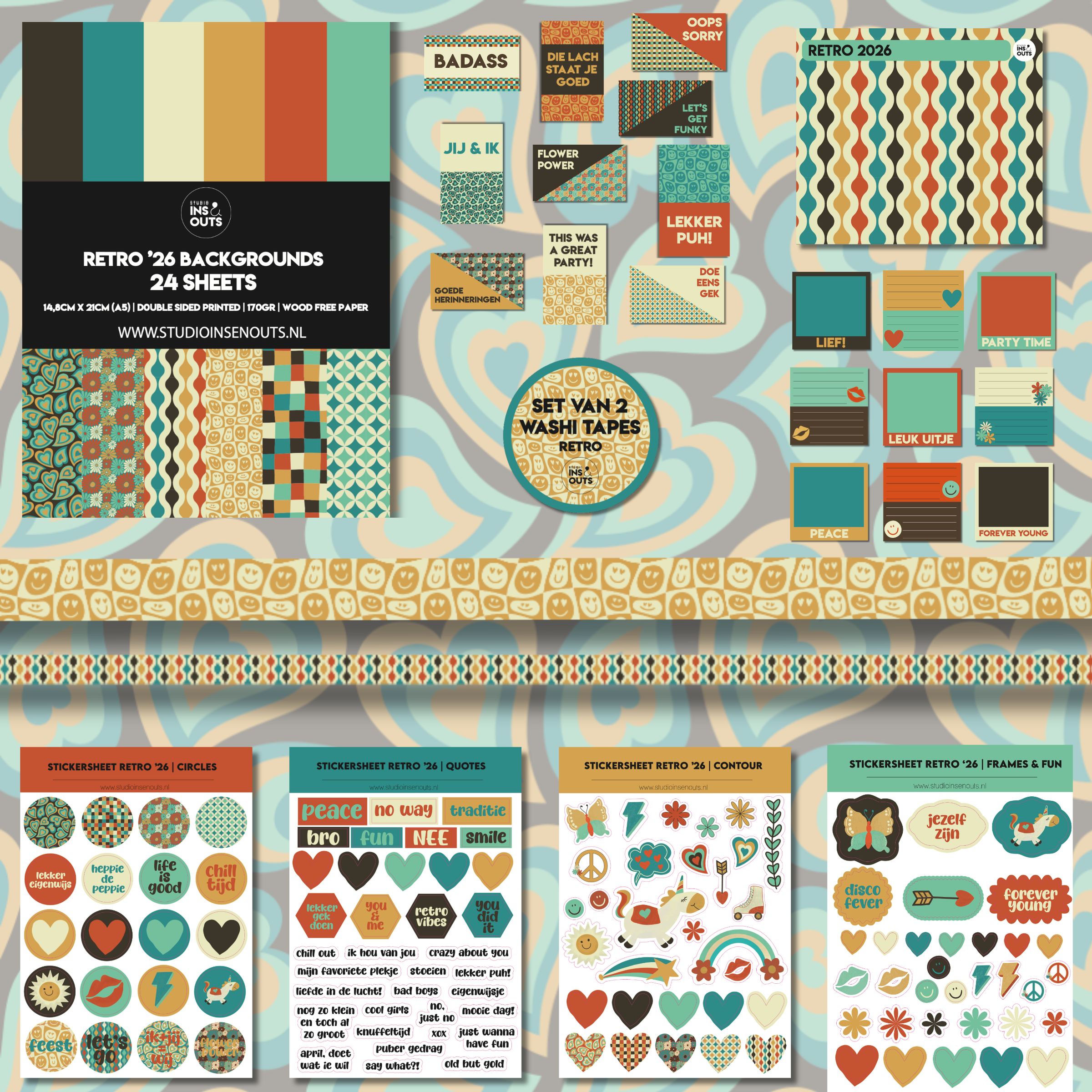 De Retro ’26 collectie van Studio Ins & Outs is een complete scrapbook set met een duidelijke retro en eigenwijze uitstraling. Deze set is samengesteld voor pagina’s over feestjes, vriendschap, tienermomenten en dagelijkse herinneringen. De collectie bevat een paperpad, stickers, washi tapes en kaartjes in een herkenbaar kleurenpalet van donkerbruin, petrol, crème, okergeel, terracotta en mintgroen. Geschikt voor scrapbooking, journaling, invulboeken en fotoboeken.