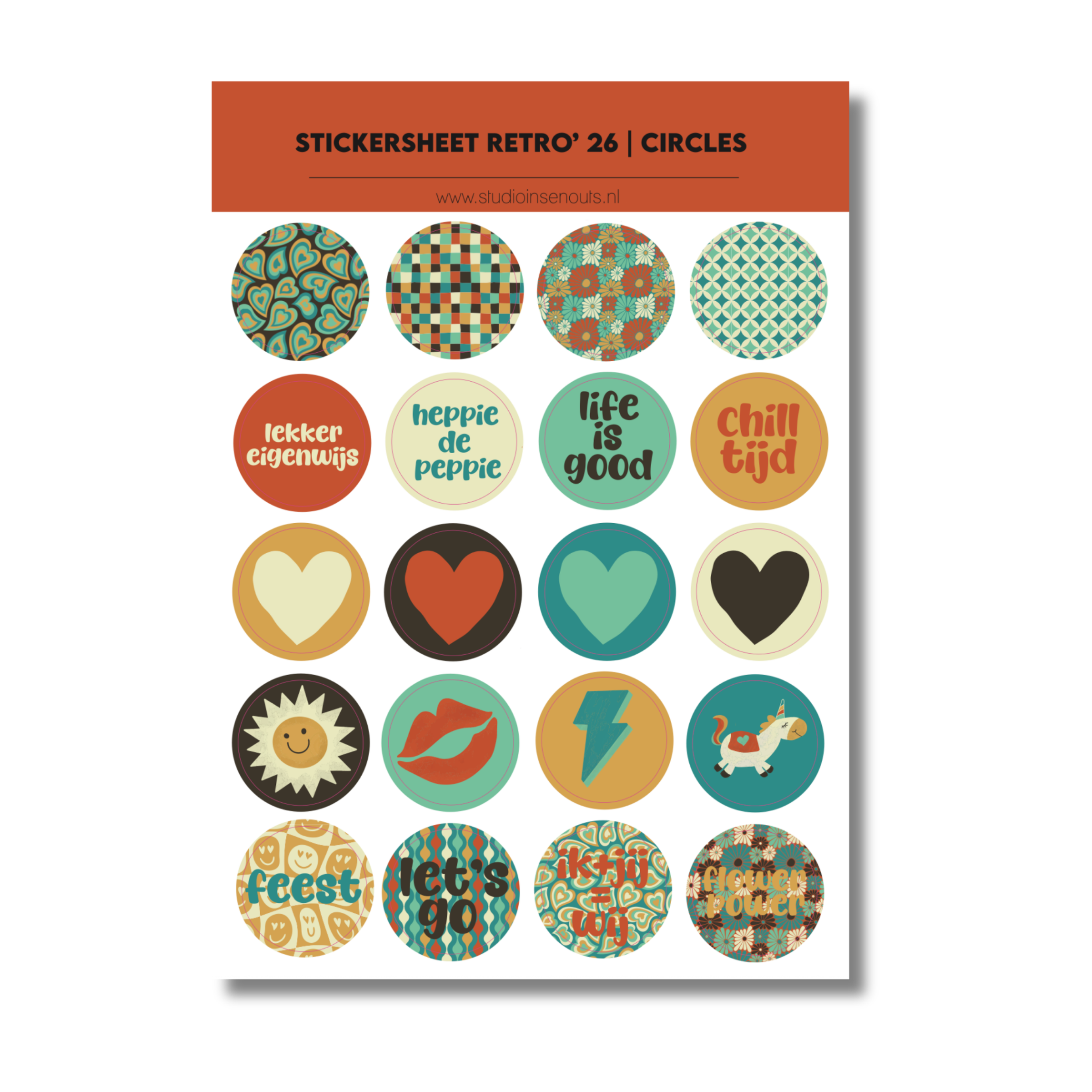 Het Stickervel Circles Retro ’26 van Studio Ins & Outs is ontworpen voor scrapbookpagina’s met een retro en eigenwijs karakter. Dit stickervel bevat ronde stickers in warme retro kleuren zoals donkerbruin, petrol, crème, okergeel, terracotta en mintgroen. De cirkelvormige stickers zijn voorzien van grafische patronen, retro illustraties en korte teksten, waardoor ze perfect passen bij feestelijke pagina’s, tienermomenten en herinneringen met een vintage uitstraling.