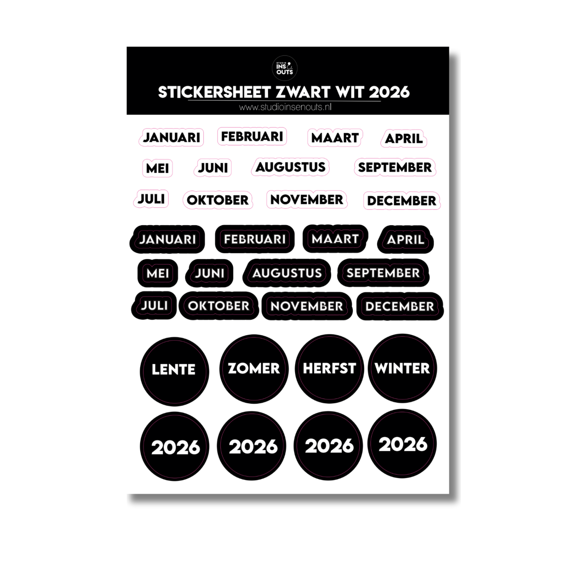 Dit stickervel Maanden 2026 van Studio Ins & Outs bevat alle maanden van het jaar, aangevuld met seizoenen en jaartallen. De maandstickers zijn uitgevoerd in een strak zwart-wit design en zijn ideaal om structuur en overzicht toe te voegen aan je planner, agenda, bullet journal, scrapbook of invulboek. Dankzij de contrasterende kleuren vallen de teksten direct op en blijven ze toch neutraal en stijlvol.