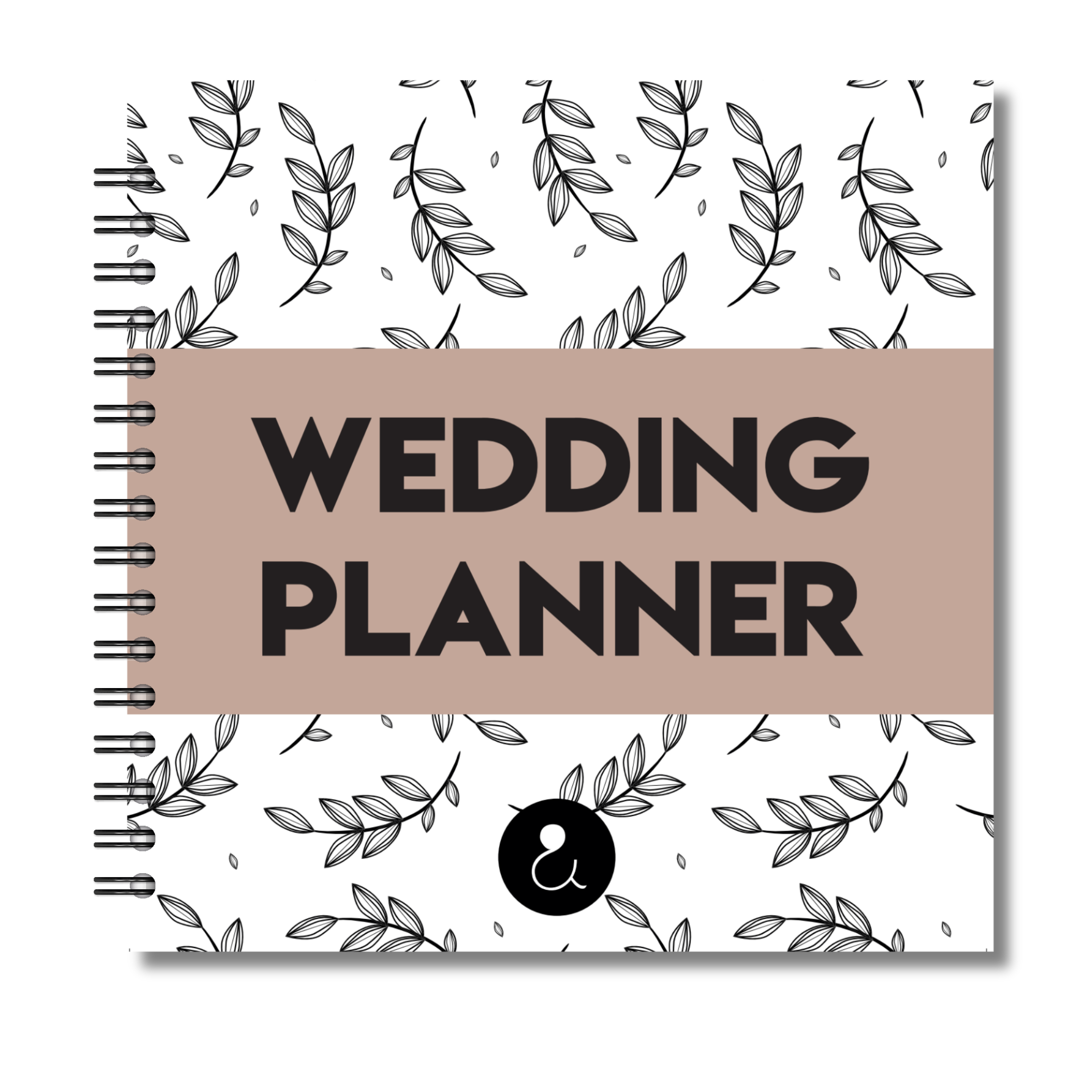 - Omslag: Botanical blaadjes print met sandkleurige band en de tekst 'Weddingplanner'