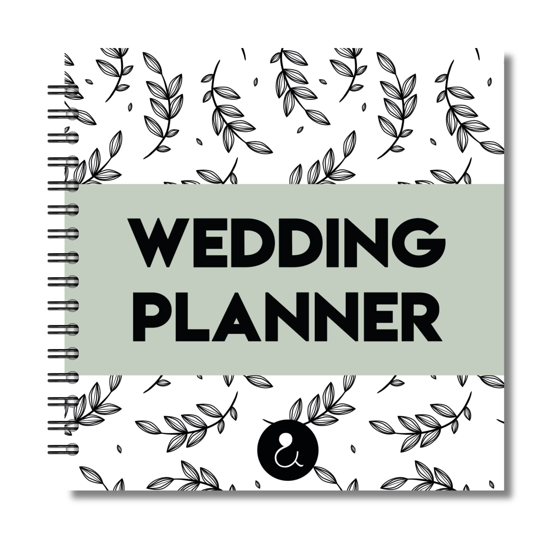 • Omslag: Botanical blaadjes print met groene band en de tekst 'Weddingplanner'