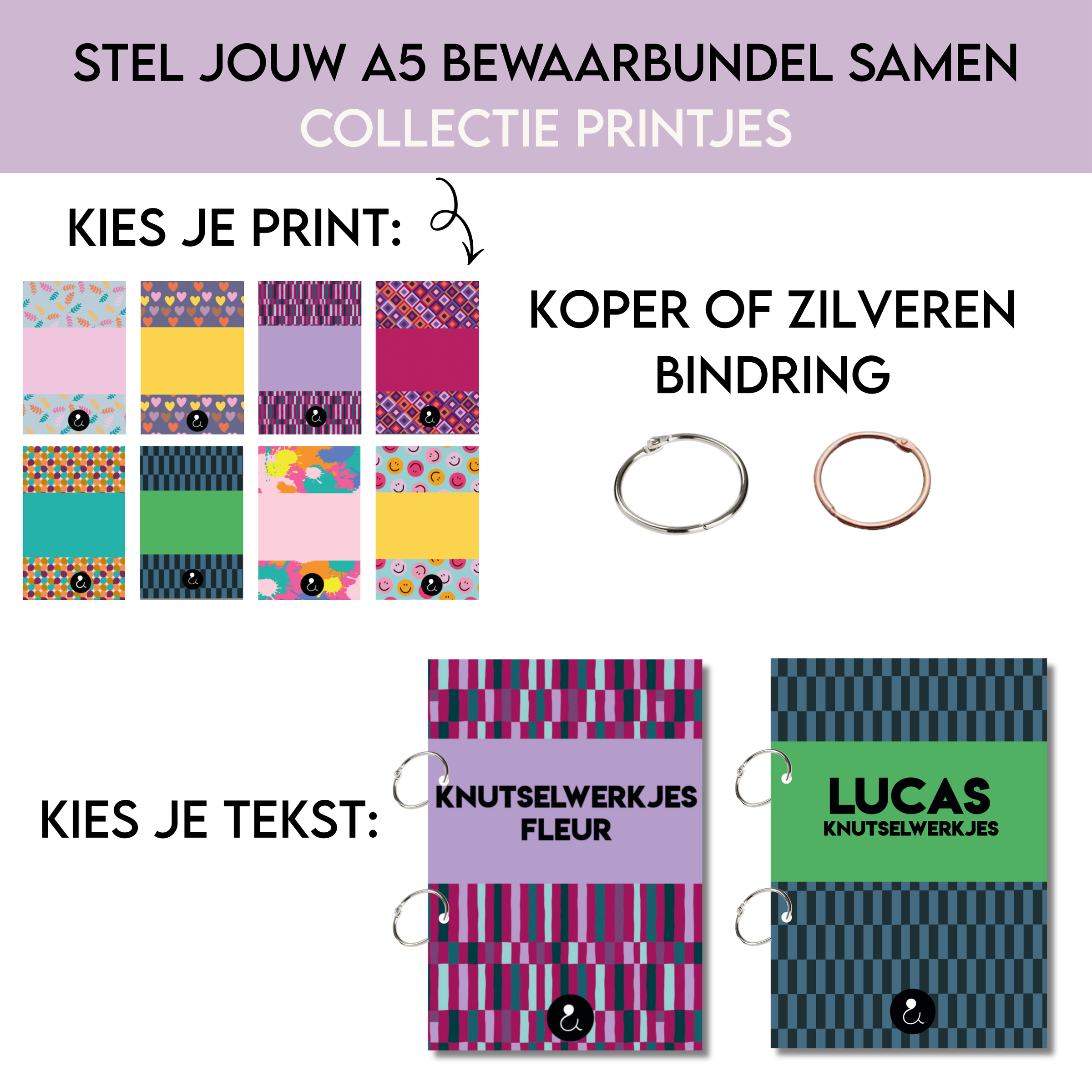 • Custom made bewaarbundel met zelf te kiezen patroon, bandkleur, tekst en ringkleur