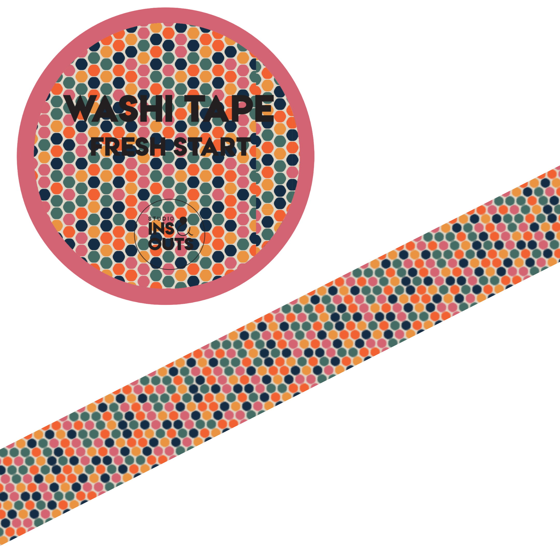 Deze brede washi tape van Studio Ins & Outs is een perfecte creatieve toevoeging aan je invulboek, plakboek, bullet journal, scrapbook of fotoboek. Met het speelse hexagon patroon in frisse kleuren breng je direct een vrolijke en georganiseerde uitstraling aan iedere pagina. De tape is ideaal voor creatieve decoratie, accentlijnen, randjes of het markeren van belangrijke momenten in je planning.